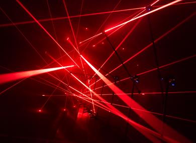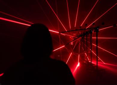 Ataraxie means ‘peace of mind’. In this installation from Maxime Houot, the artist asks us to question what this might mean in a changed and still changing post-pandemic world. A row of lasers fills the space with beams of red light that first form simple crosses, before building up complex, tesseract-like structures.